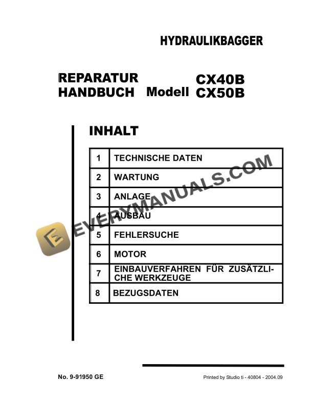 Case CX40B, CX50B Hydraulic Excavator Repair Manual 9-91950 GE PDF