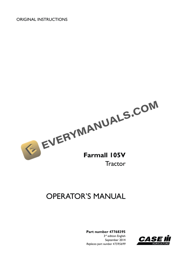 Case Farmall 105V Tractor Operator Manual 47768395 PDF