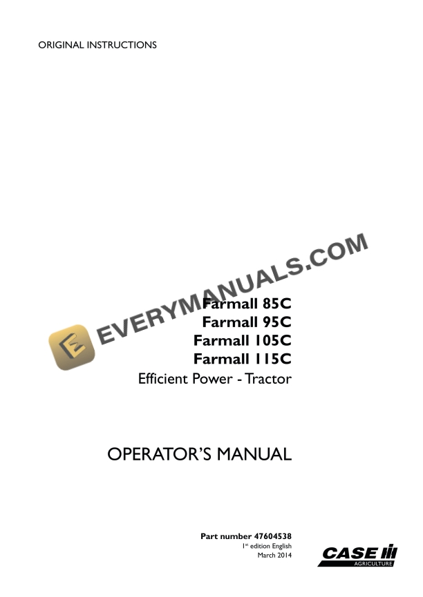 Case Farmall 85C, 95C, 105C, 115C Efficient Power Tractor Operator Manual 47604538 PDF
