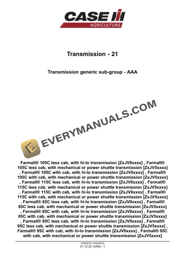 - Farmall 95C With Hi-Lo Transmission – With Mechanical or Power Shuttle Transmission Tractor