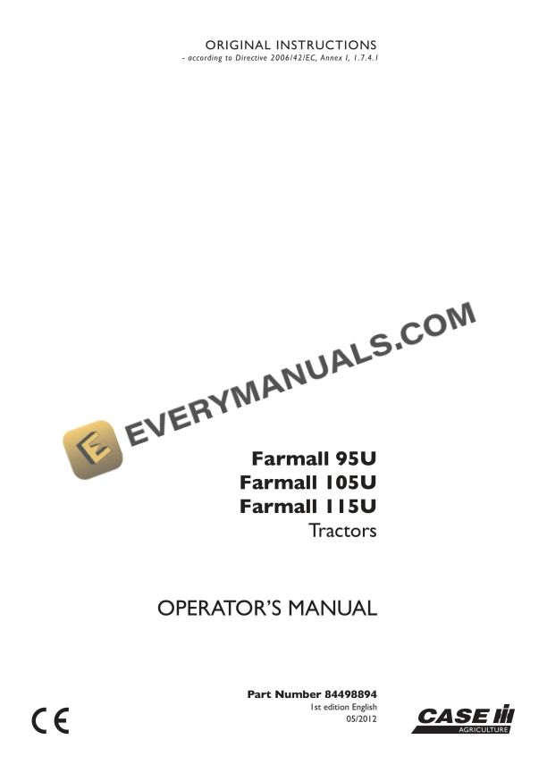 Case Farmall 95U, 105U, 115U Tractor Operator Manual 84498894 PDF