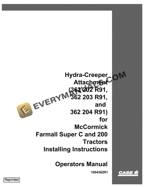 Case Hydra-Creeper Attachment (362 202 R91, 362 203 R91, 362 204 R91) for McCormick Farmall Super C and 200 Tractors Installing Instruction Operator Manual 1004362R1 PDF