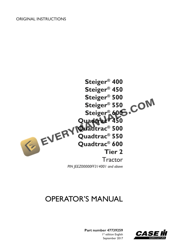 Case Steiger 400, 450, 500, 550, 600, Quadtrac 450, 500, 550, 600 Tier 2 Tractor Operator Manual 47739259 PDF