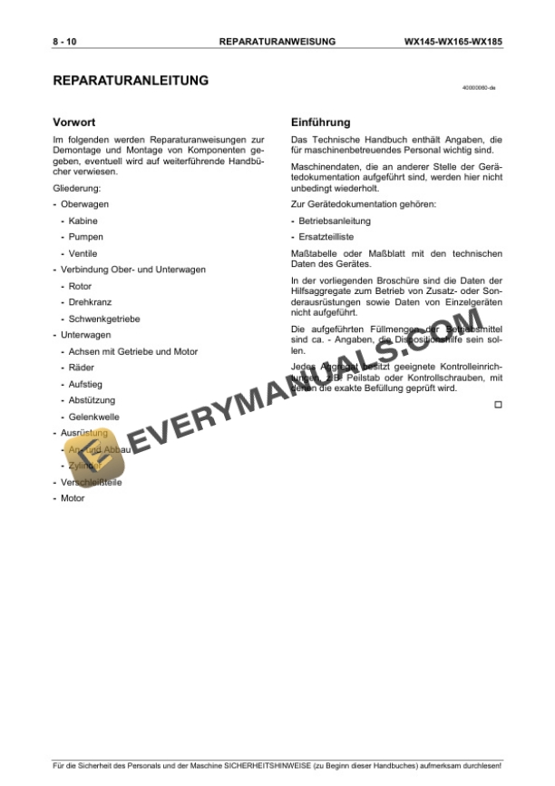 Case WX145, WX165, WX185 Hydraulic Excavator Repair Manual 9-91231 DE PDF
