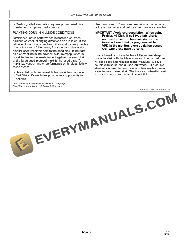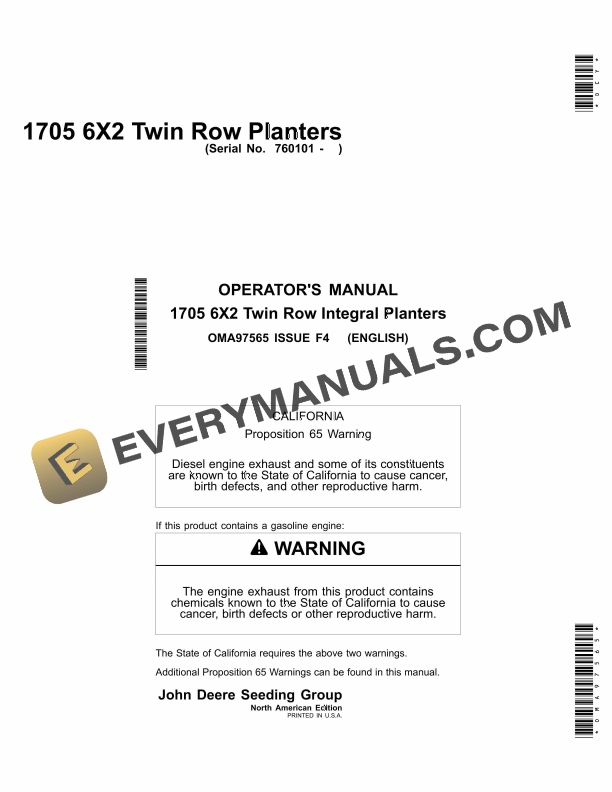 John Deere 1705 6X2 Twin Row Integral Planter Operator Manual OMA97565
