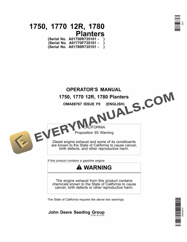 John Deere 1750, 1770 12R, 1780 Planter Operator Manual OMA88767