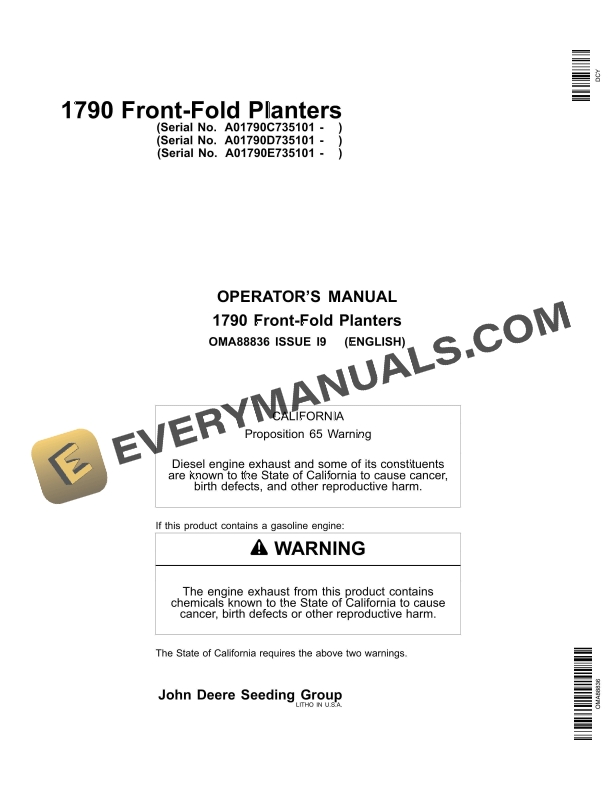 John Deere 1790 Front- Fold Planter Operator Manual OMA88836