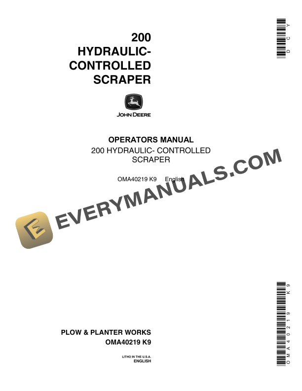 John Deere 200 Hydraulic Controlled Scraper Operator Manual OMA40219
