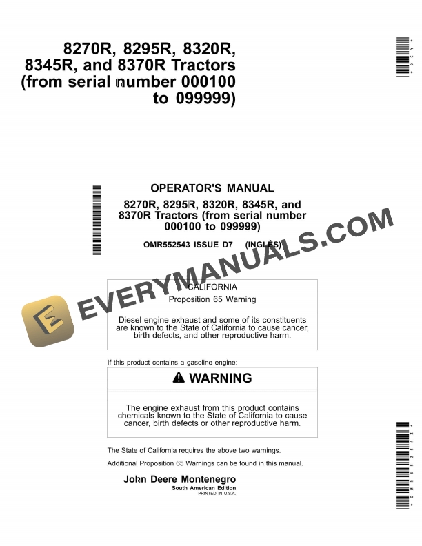 John Deere 8270R, 8295R, 8320R, 8345R, 8370R Tractors Operator Manual OMR552543