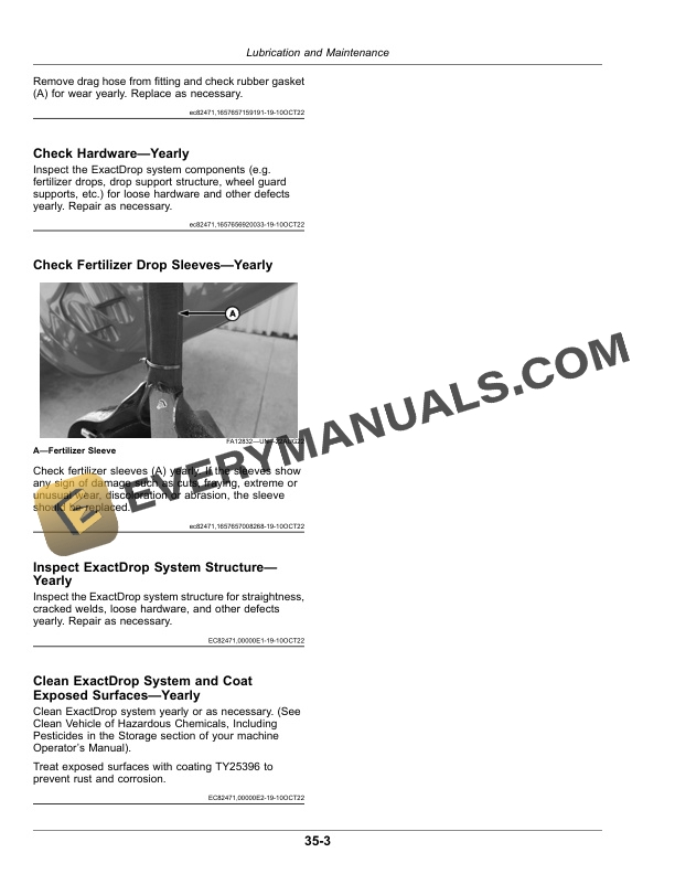 - 7.8. Check Fertilizer Drop SleevesYearly