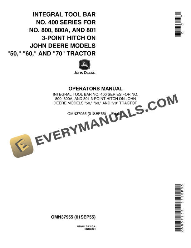 John Deere Integral Tool Bar No. 400 Series For No. 800, 800A, and 801 3-Point Hitch Operator Manual OMN37955