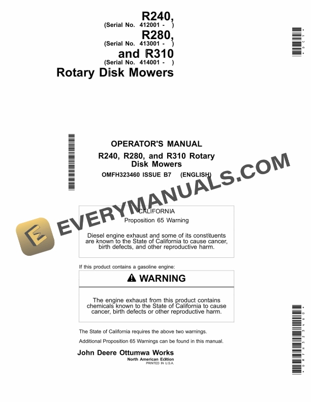 - 1.11.1. R240, R280, and R310 Rotary Disk Mower Specifications (Specifications and design are subject to change without notice.)