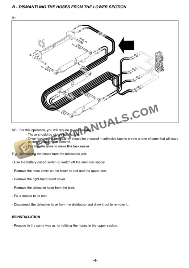 - 1.4.1. Dismantling the hydraulic hoses fitted on the arms, runners and telescopic unit