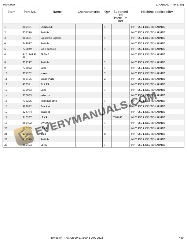 Manitou MHT 950L Deutsch Armee Parts Manual 648768