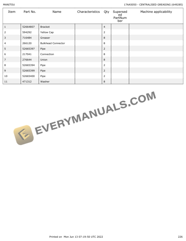 - 6.1. A5050 CENTRALISED GREASING (649285)