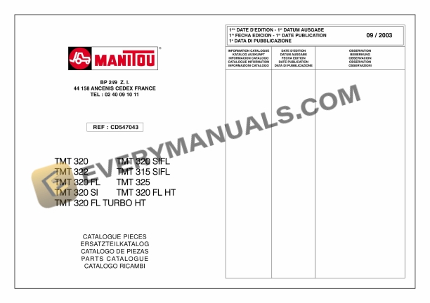 Manitou TML 320, TML 322, TML 320 FL, TML 320 SI, TML 320 SIFL, TML 315 SIFL, TML 325, TML 320 FL HT, TML 320 FL TURBO HT Parts Manual CD547043